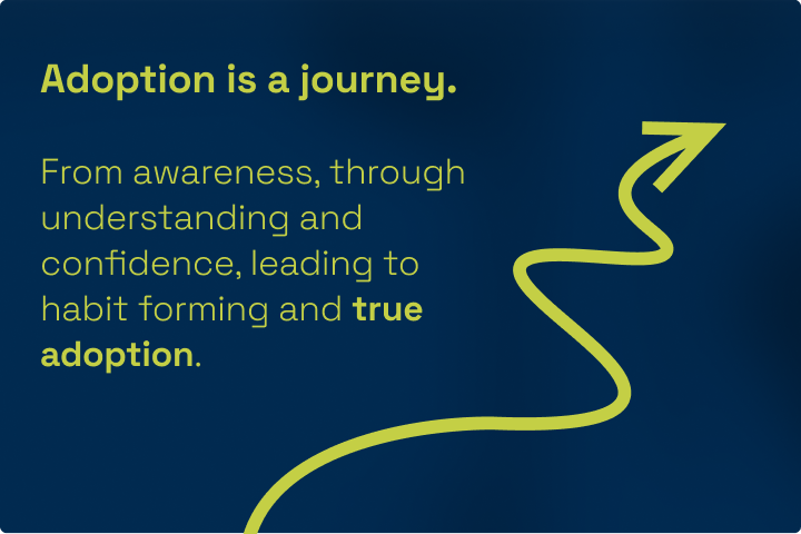 The reason the pathway matters is that adoption rarely happens in a single moment. It's a journey, and like any journey it has distinct stages – awareness, understanding, first use, growing confidence, habit formation, and finally the kind of embedded use where the solution becomes the new normal - true adoption. Each of those stages presents its own challenges, and each needs to be actively designed for.