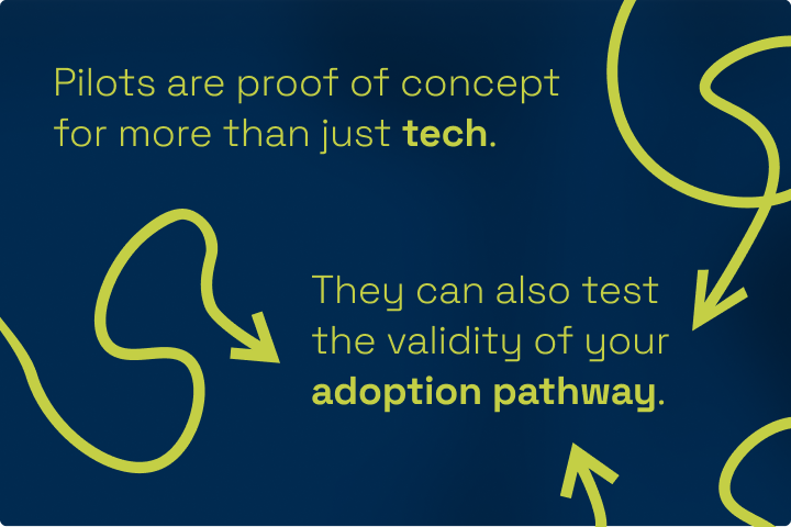 Pilots are typically treated as a proof of concept for the technology. They should also be treated as a proof of concept for the adoption pathway. Real-world usage will surface friction that no amount of research or testing fully anticipates – where engagement drops off, which user groups are struggling and why, what workflow tensions emerged that weren't expected. The post-pilot phase is a critical inflection point, and one that's frequently underused. Some teams iterate on their product based on what they learn in the pilot - fewer iterate on their adoption strategy with the same rigour.