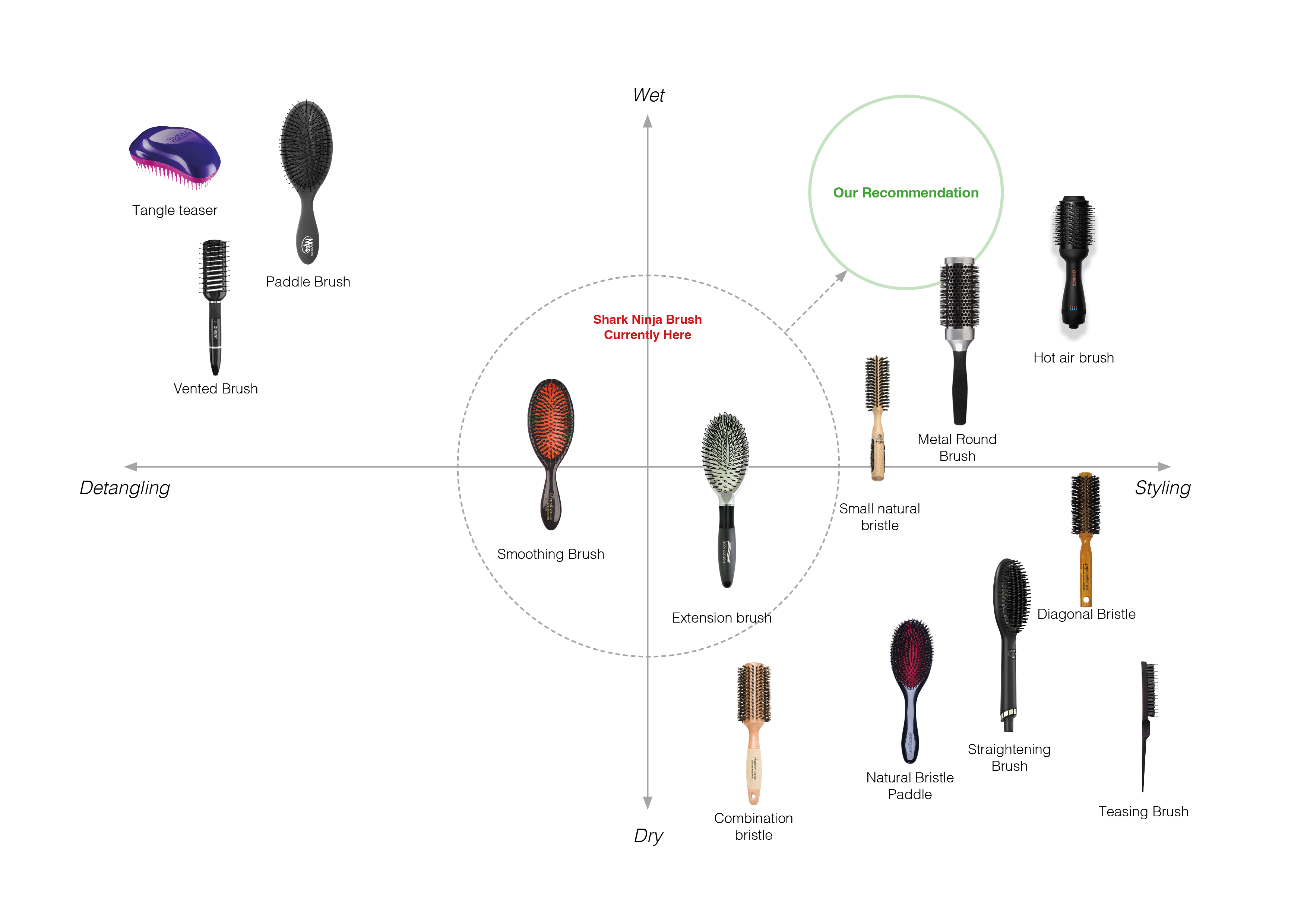 After testing the current design and a round of market research our team discovered that the current ‘one size fits all’ brush solution was not suitable for different hair types. Our recommendation was to explore one type of brush in order to fulfil part of the users hair care routine. We re-directed the brush concept into an untapped marketplace by functioning as a ‘secondary wet styling brush’.