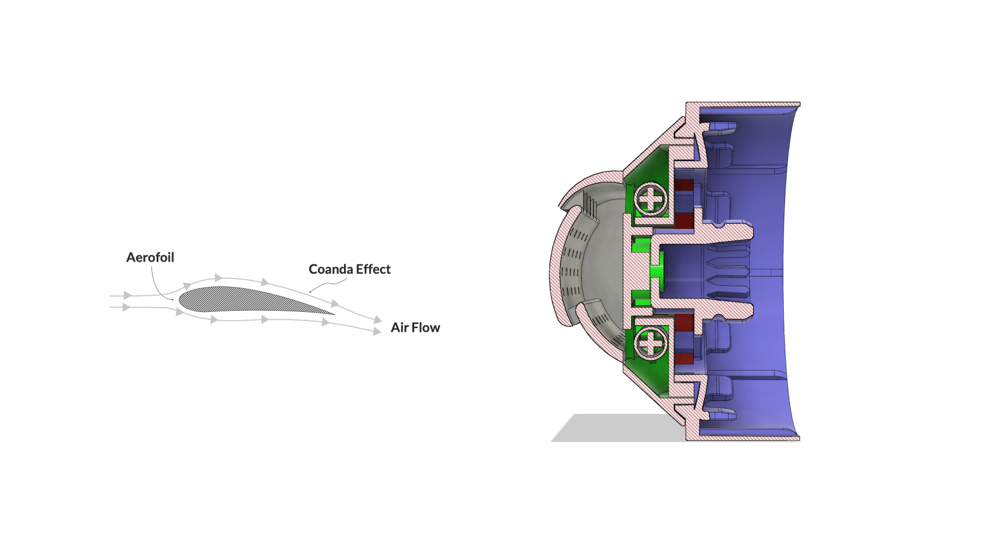 In phase 2 our focus was to optimise the air flow of concept 3B using the coanda effect principle. We used CAD, 3D printed prototypes and CFD analysis to refine the air pressure and airflow direction. We went through a series of iterations before delivering the final geometry.