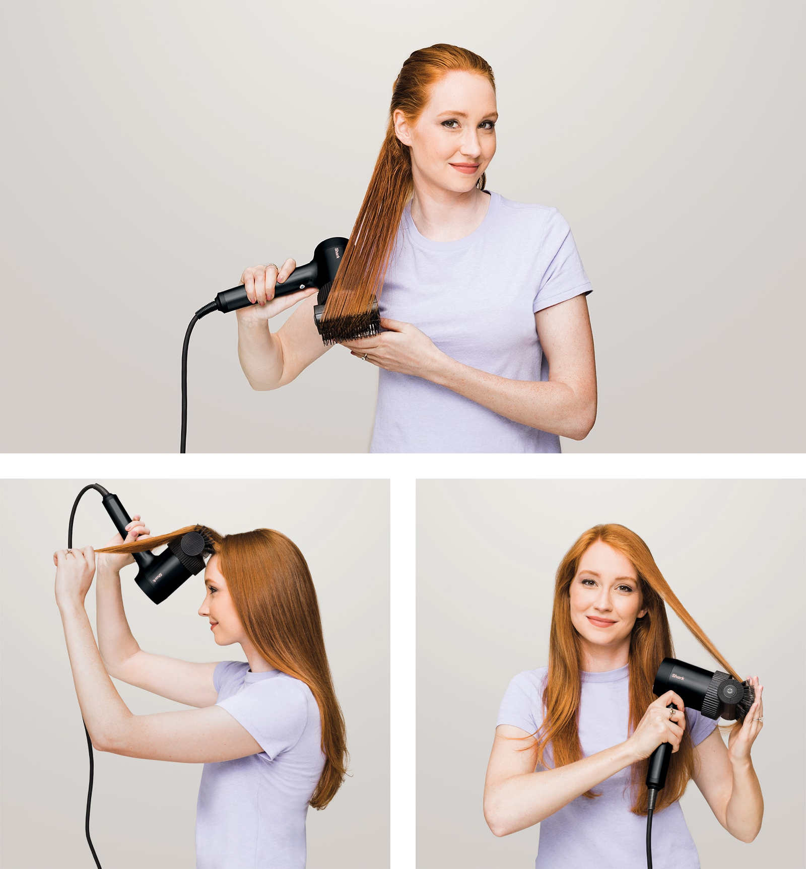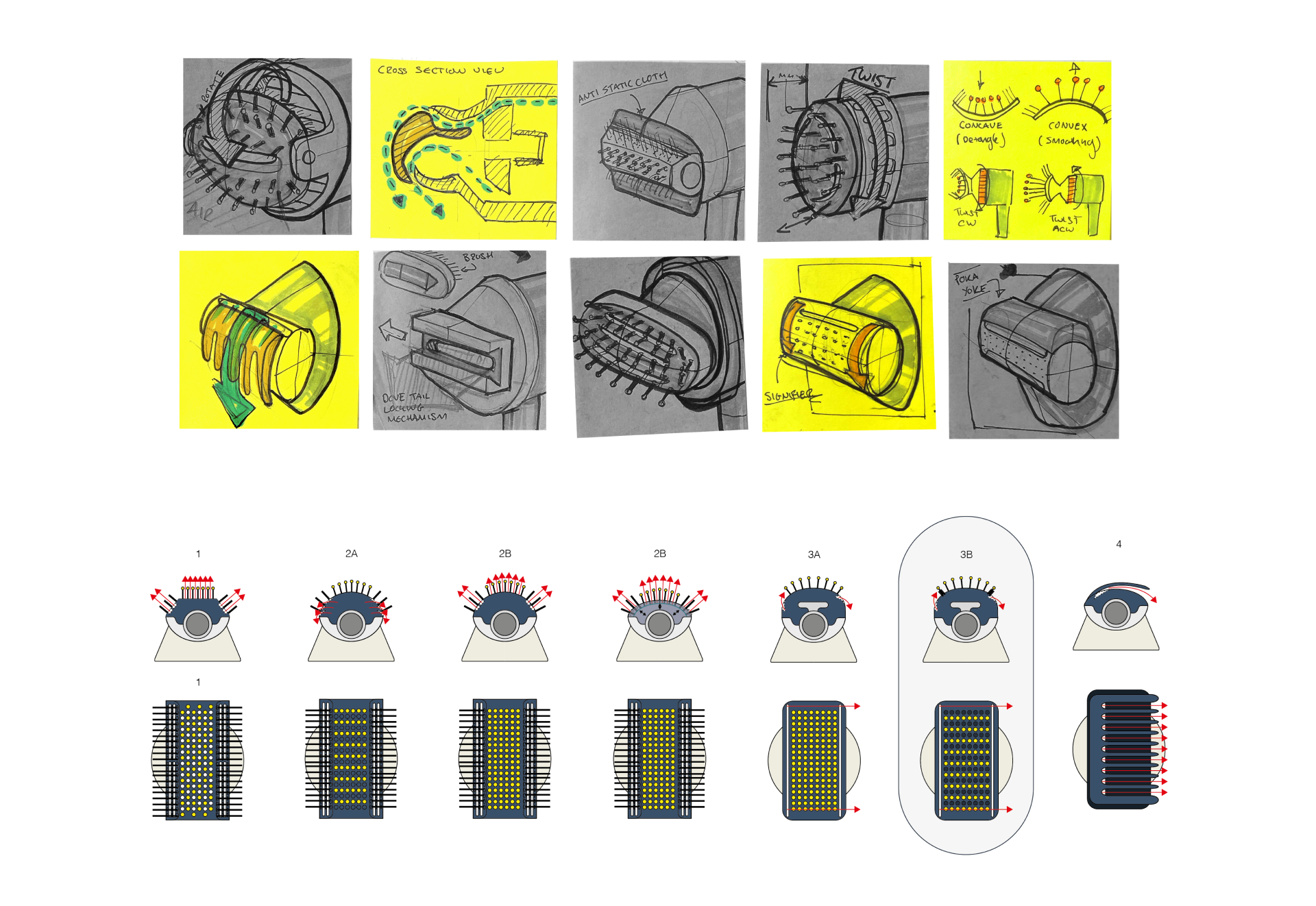 The shape and size of the brush head and bristles were tailored to make the design more suitable for brushing straight and wavy hair when wet. After presenting this approach to the client, they chose concept 3B ((rounded barrel with single direction air flow) to develop further.