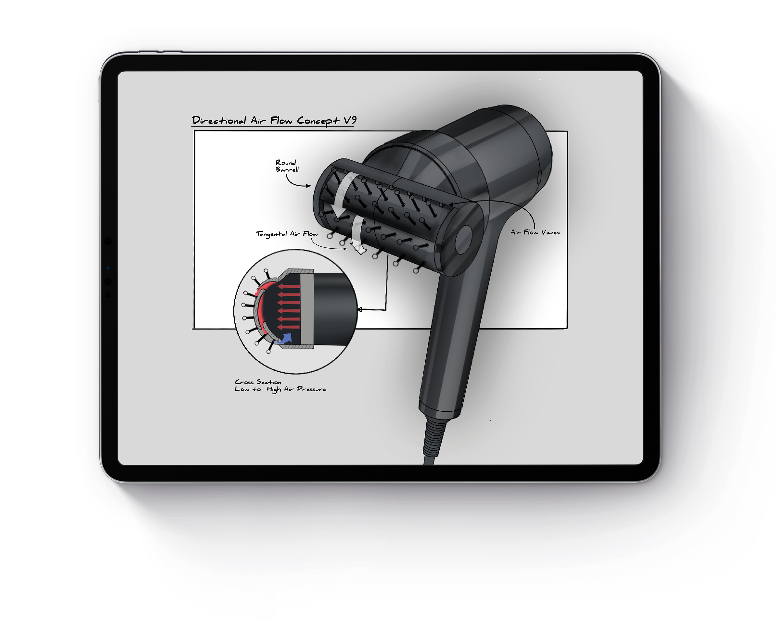 Shark Beauty briefed our design team to solve a key functional issue with their new hair brush accessory. The current design produced an unpleasant user experience (choppy-ness) when one brushed through their hair. In order to solve the products pain points, our design proposal was threefold: